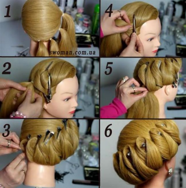 - Отделяйте волосы равными прядями и скрутите их улитками. Закрепляйте на голове шпильками с украшениями (бусинками, камушками) или без.