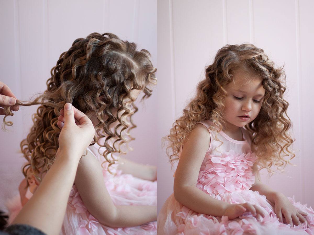 - Малышкам с длинными прядями можно распустить волосы, подкрутить их, используя бигуди или плойку, затем красиво уложить волнистые локоны.