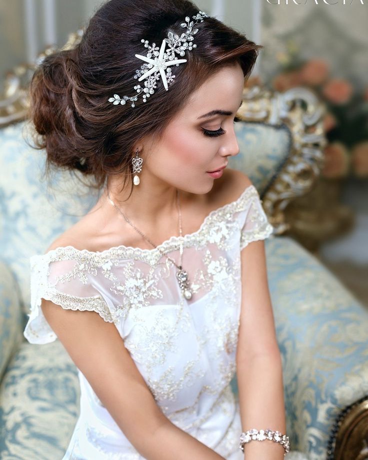 73. Красивый низкий пучок со свадебными аксессуарами для волос и замысловатым дизайном