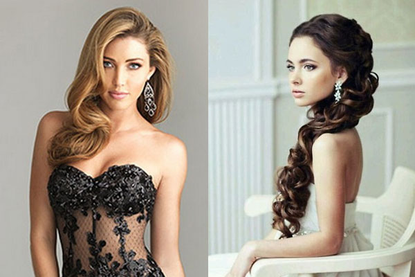 Для длинного, облегающего платья в пол идеально подойдут объёмные прически: крупные завитки на одно плечо, высокие укладки. Пышный наряд лучше всего дополнит несложная укладка, например, незамысловатый пучок, распущенные прямые волосы, романтические причёски со слегка завитыми прядями и длинные локоны, уложенные ниспадающими волнами. Красоту и оригинальность платья, открывающего только одно плечо, подчеркнут волосы, переброшенные на оголённую сторону.