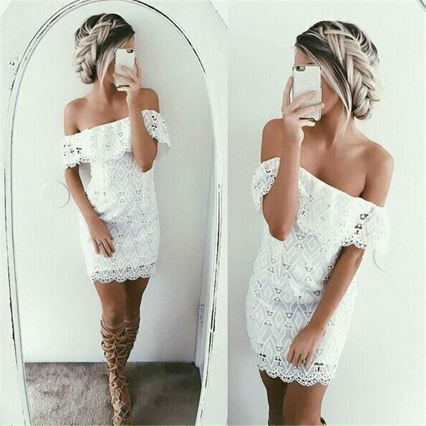 Для мини-платья с открытыми плечами отлично подойдут короткие стрижки, а также все причёски, которые открывают шею: высоко завязанный хвост, пучок, гладкие прямые пряди. Не стоит перегружать лук вычурными и сложными укладками, это очень утяжеляет образ и лишает его гармонии.