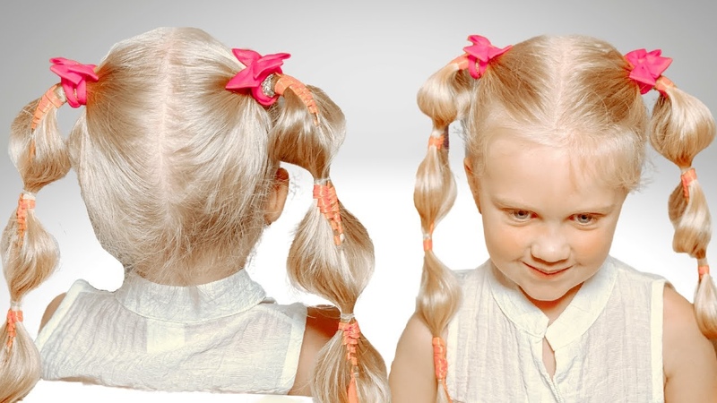 15. Оригинальную шишку можно сделать быстро и просто: волосы делятся пополам; из них делаются 2 хвоста над ушами; каждый хвост тоже делится на 2 пряди, которые закручиваются в спираль и фиксируются снизу резинками.