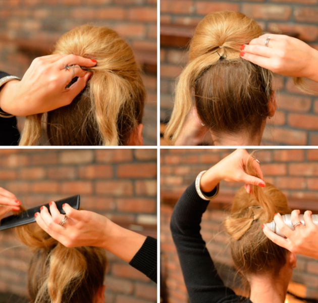- Соедините начес с остальными прядями и завяжите хвост как раз на уровне валика.