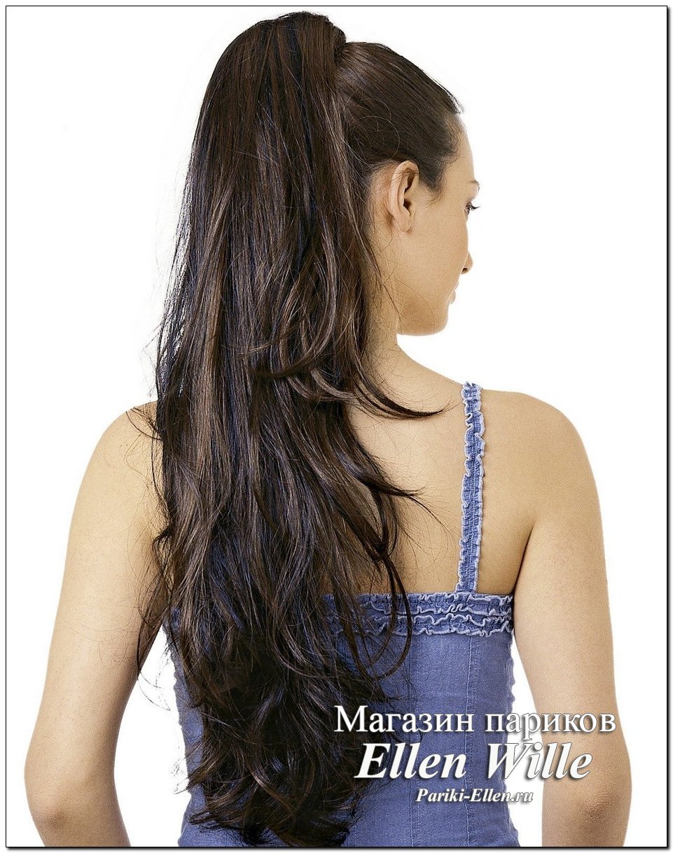 Шиньон в виде длинного конского хвоста можно назвать универсальным. Он помогает создать наибольшее число разнообразных образов. Его носят без дополнительной укладки, просто пристегнув к собственному короткому хвостику, а можно его закрутить в локоны или сделать гофре.