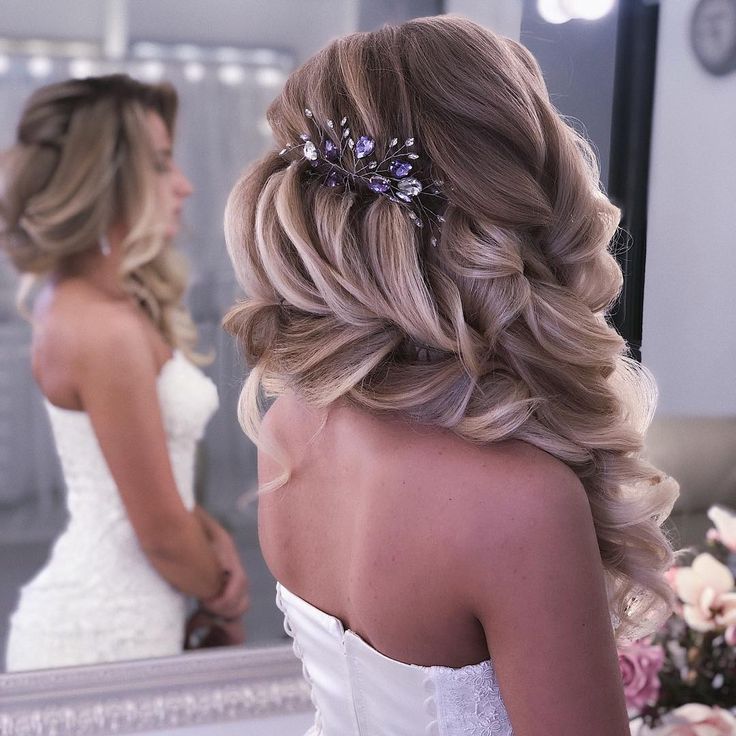 Свадебные прически с полураспущенными волосами никогда не исчезнут, создавая красивое ощущение распущенных волос с дополнительными деталями, которые можно создать, заколов несколько волос. Добавьте мягкость изгибов для эфирного прикосновения, это придает пуховому стилю уникальность и ненавязчивый интерес.