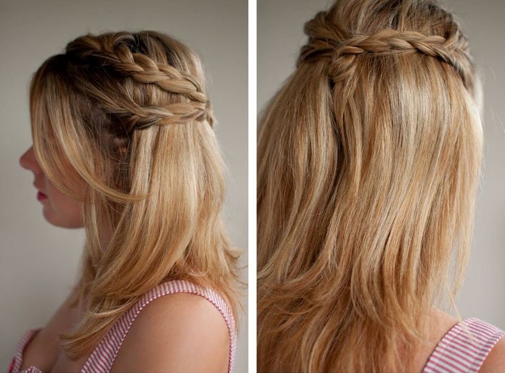 Ободок из косичекЕсли у вас кудрявые волосы, то такая прическа просто незаменима для вас, это простой и легкий вариант украсить прическу с распущенными волосами. Все что вам нужно это заплести две маленькие косички и сделать из них ободок, перекинув на противоположную сторону. Кончики косичек прячутся в волосах и закрепляются невидимками.