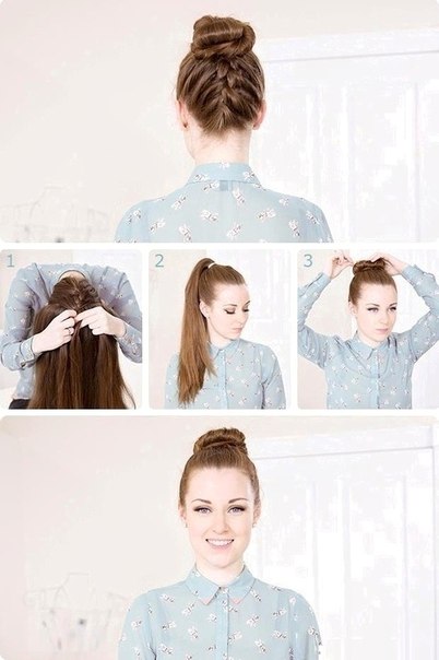 Одним из вариантов прически на каждый день пошагово, представленной далее, является высокий пучок. Он отлично подойдет на среднюю длину волос, при этом выглядит очень стильно и хорошо дополнит офисный образ.