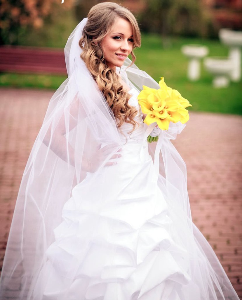 Пышные естественные локоны длинных волос и волос средней длины могут быть накрыты фатой, не короче длинны волос, на макушке. Крепится обычным гребешком на фате, для прочности можете сделать начес на макушке и гребешок зафиксировать невидимками. Это модно, романтично, женственно и красиво.