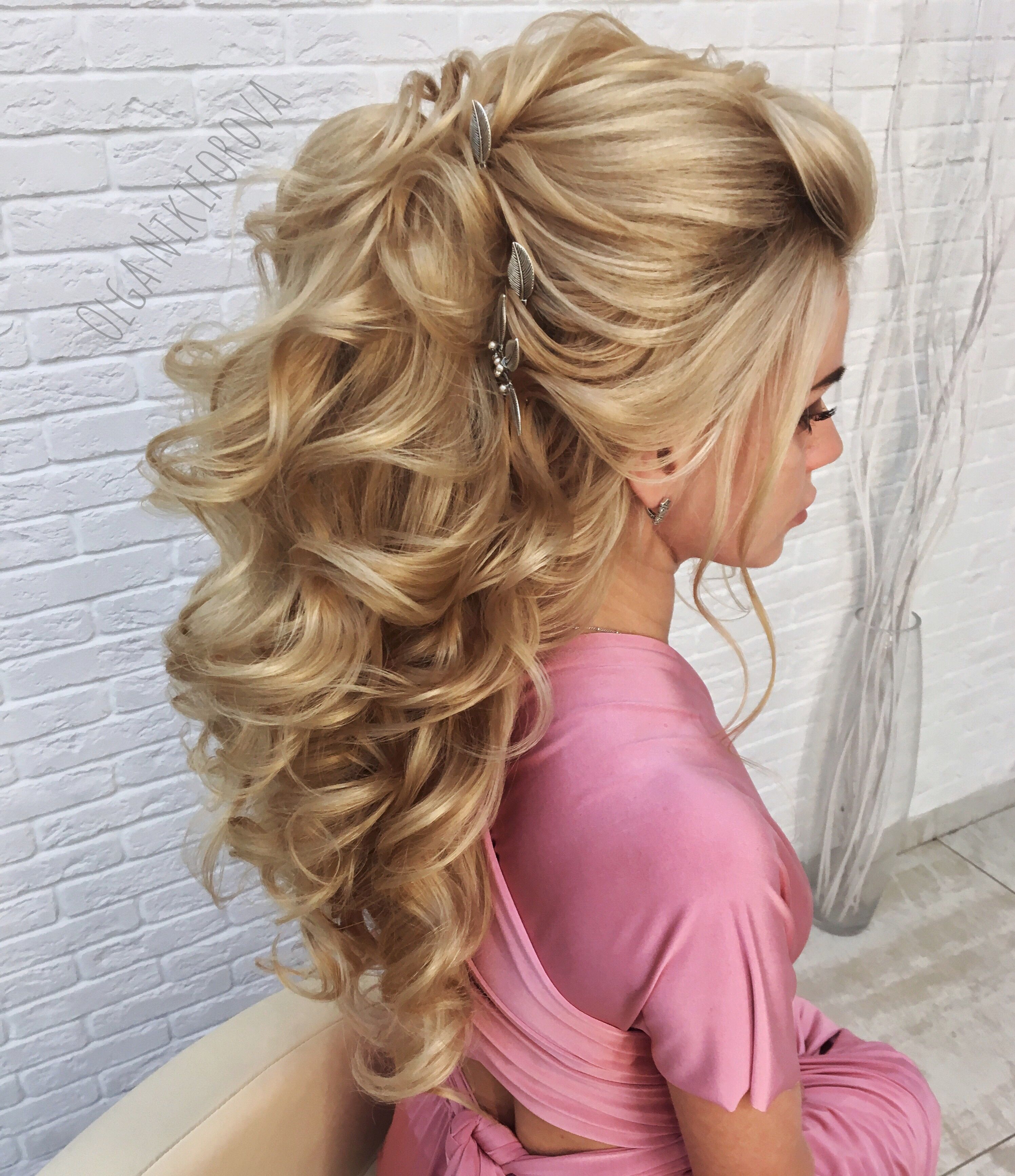 Идеальный вариант для девушек с продолговатым лицом. Укладка может содержать в себе и локоны, и плетения, но не переборщите с украшениями — всего должно быть в меру.