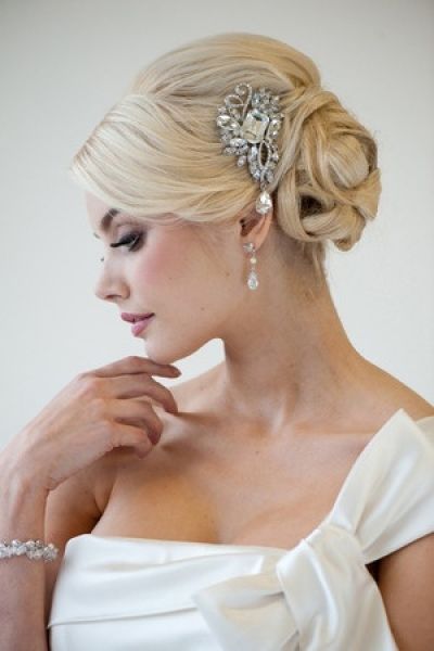 sourceЭта свадебная прическа понадобится для укрощения волос с помощью изделия. Волосы имеют дополнительный объем и зачесаны назад и по бокам.