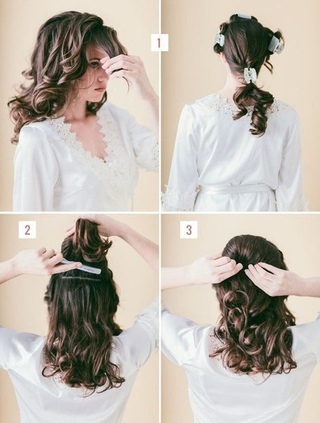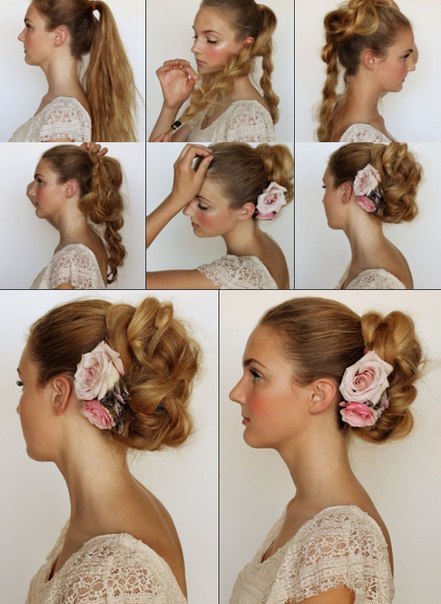 можно воспользоваться накладным шиньоном или приколоть искусственные пряди. Прядки накладных волос предварительно накручивают таким образом, чтобы получились мелкие локоны. После этого их поочередно укладывают в пучок, располагая на затылочной части головы; - Распределяя в прическе волосы, укладывать локоны нужно так, чтобы завитки не растрепались и сохранили свою форму.