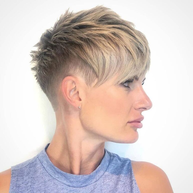 Стрижка пикси с зачесанными набок блондинками — отличная прическа, особенно если волосы на затылке редеют. Кроме того, глубокая боковая часть создаст красивый контраст между низкими волосами и большими волосами.