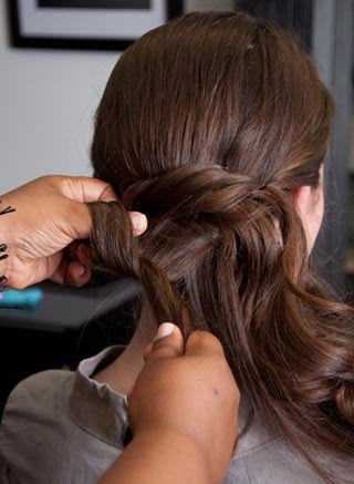 3. Нижнюю секцию сзади скручиваем вправо движением сверху вниз и закалываем невидимками. Теперь верхнюю часть скручиваем по направлению к этому жгуту и также закрепляем невидимками.