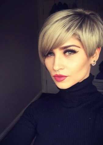 Это очень короткая стрижка с короткой челкой. Она отличается от каре и боба тем, что в височной области и на затылке шевелюра должна быть намного короче, по сравнению с макушкой. Такой вариант подойдет девушкам с маленьким личиком, а также модницам с необычными и крупными чертами лица. Прическа подчеркивает пухленькие губки с выразительными глазами, делая акцент на лице.