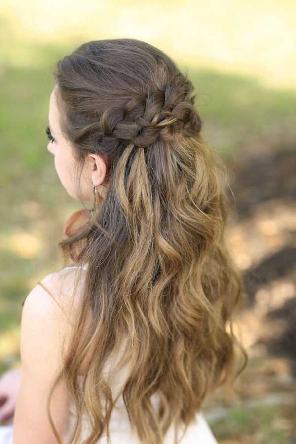 Если вам нужна кокетливая прическа на длинные волосы для вашего школьного бала или другого мероприятия — это достойный вариант. Венок из цветов может показаться несколько излишним для полуформальных мероприятий, поэтому можно добавить несколько бутонов для простоты образа.