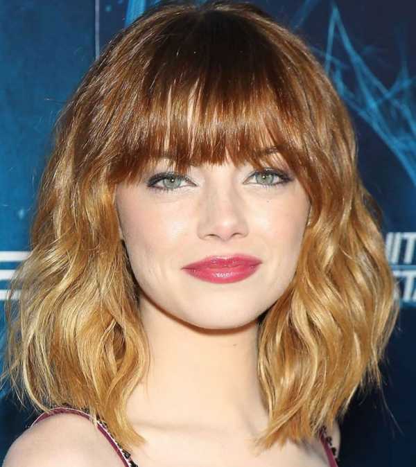 Для лиц такого типа, рекомендуем обратить внимание на прическу удлиненное каре с ровной челкой, чуть выше бровей. Такая стрижка с челкой способна спрятать довольно большой лоб и в то же время немного расширить лицо за счет волос по бокам. Рекомендуется укладывать волосы в легкие локоны и делать небольшой начес для большего объема.