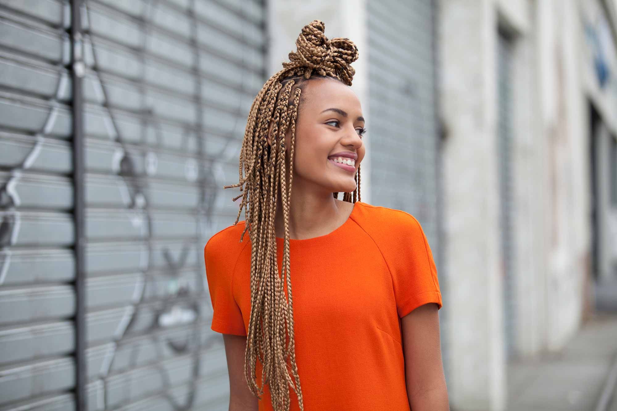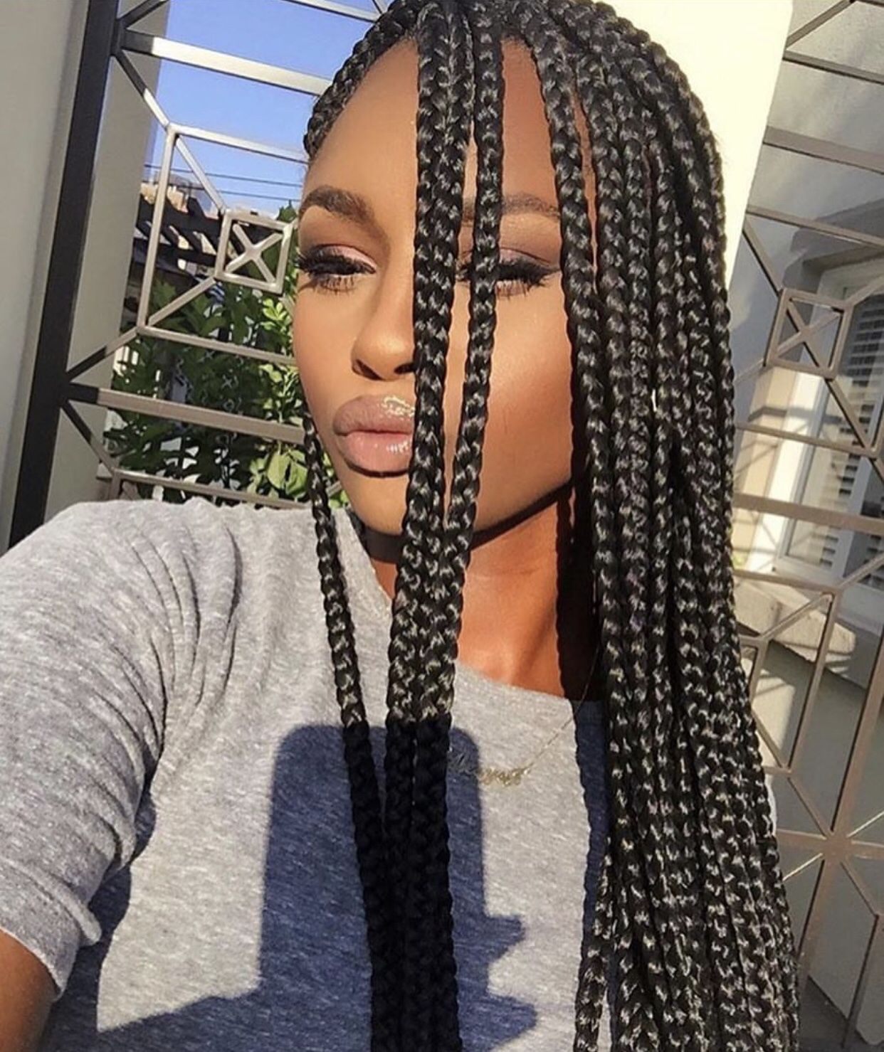 Получите великолепную текстуру с помощью тонких сенегальских косичек. Потянув их в сторону, чтобы задрапировать шею, вы создадите сексуальный образ. Простая прическа, но она привлекает внимание на улицах.