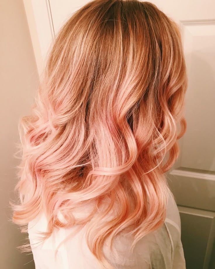 Окрашивание розовое золото с персиковыми оттенкамиЭти оттенки розового золота чуть ближе к теплому персиковому.