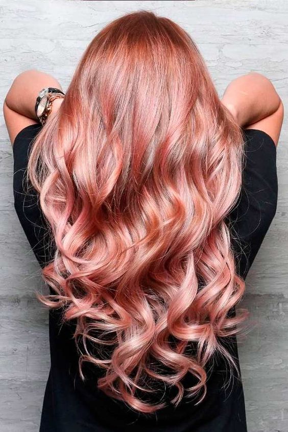 Цвет розового-золота хорошо сочетается почти со всеми натуральными оттенками волос. Поэтому Вы можете окрасить нижнюю часть волос, не заботясь об окрашивании верхней части у корней или несколько прядей вблизи лица в оттенках яркого розово-золотого!