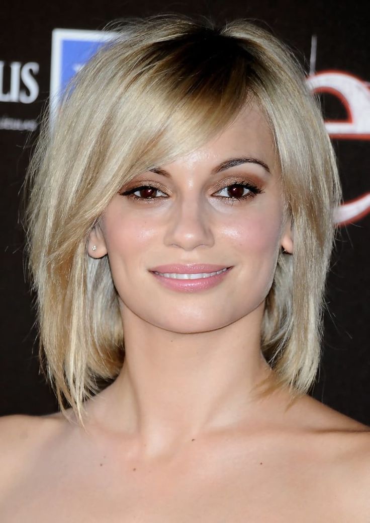 Нам нравится, насколько гладкой является этот стиль. В волосах средней длины нет слоев, за исключением длинной широкой косой челки, которая обрамляет лицо. Этот стиль предназначен для женщин с овальными или длинными формами лица с выступающим лбом. Челка идеально подстрижена и сливается с длинными слоями по бокам лица.