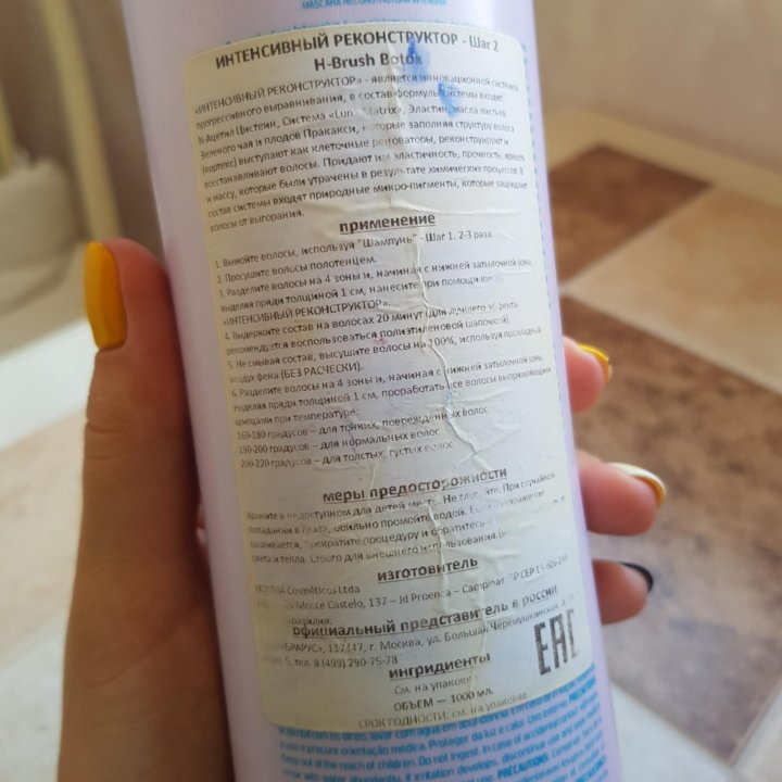 Ботокс в моем случае белый, есть еще синий (убирает желтизну) и розовый. Распределяю его кисточкой от краски для волос. Процедура легкая, занимает час-полтора. В процессе есть неприятный резкий запах, может вызывать раздражение глаз, По этой причине сушить волосы феном нужно от лица.
