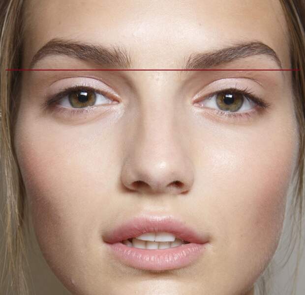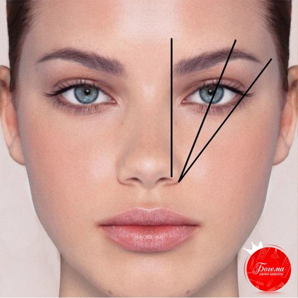 - от центра подбородка проводится линия через край кончика носа, не путать с крылом. Это точка тела брови;