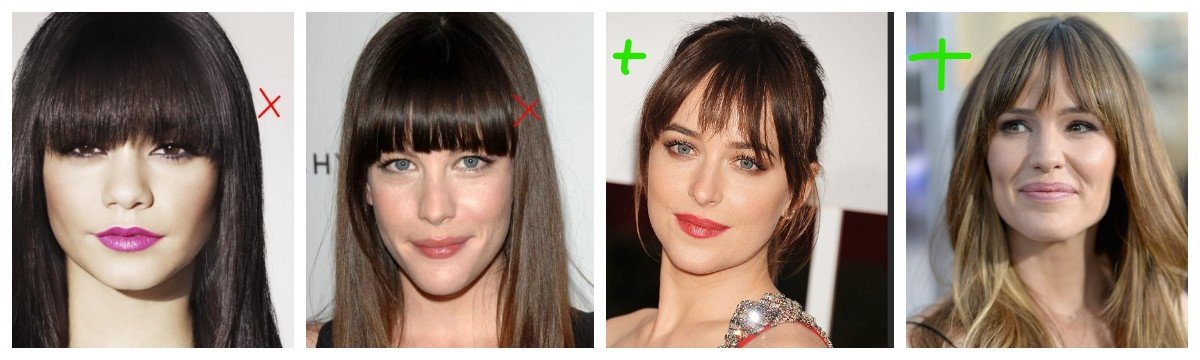 Уравновешивает данный тип лица густые и прямые челки, достигающие бровей. Это придаст гармоничность образу, и сгладит пропорции.
