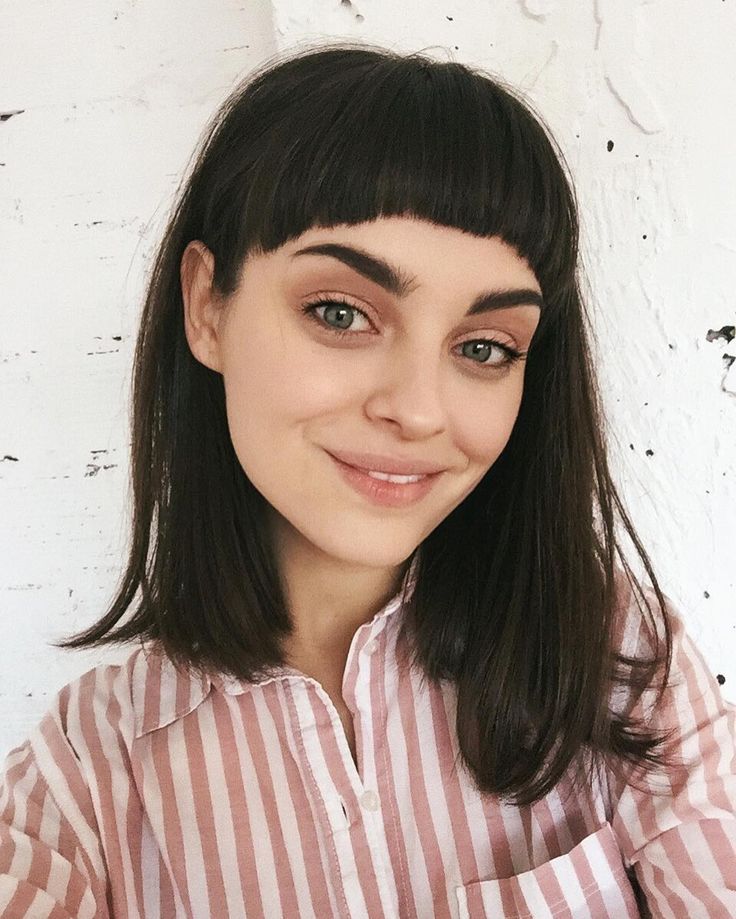 @barbararabelo_ | социальные сетиИ, конечно, такая челка прекрасно выглядит на овальном лице. Боковые пряди в этом случае могут быть до линии подбородка — так получится выделить линию шеи и сделать ее визуально более изящной.