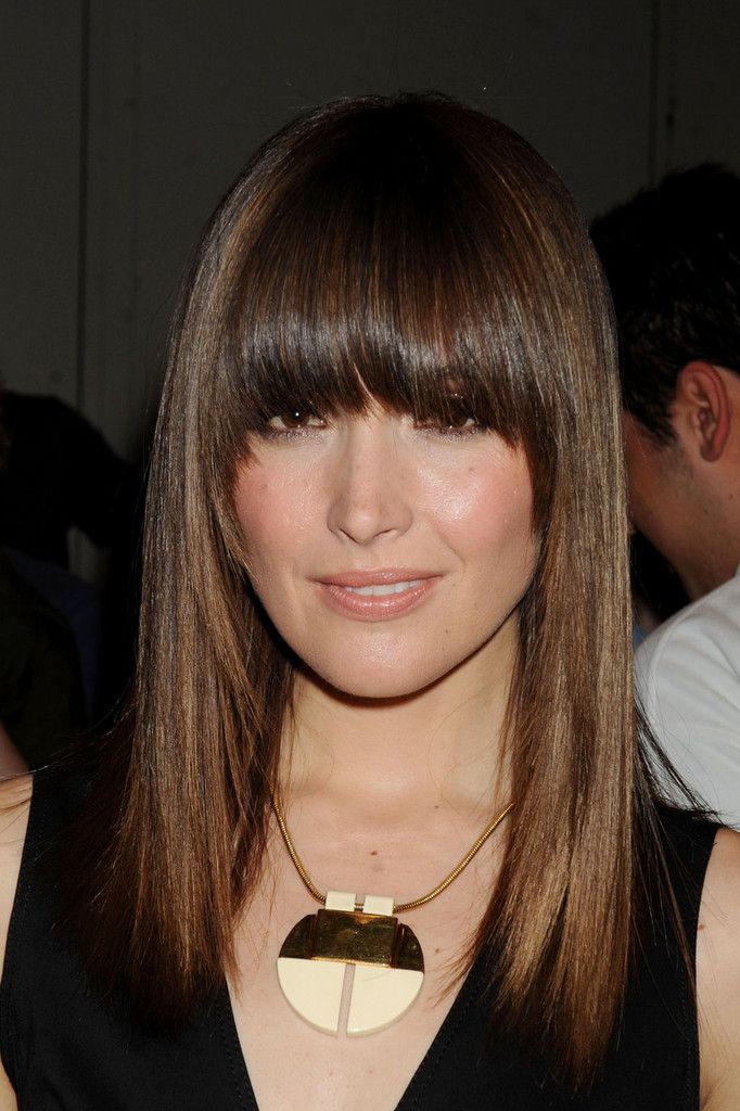 Хорошо контрастирует с длинными волосами прямая челка до бровей с длинными прядями у висков.