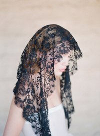 Используйте испанский стиль свадьбы, выбрав для себя образ страстной танцовщицы фламенко. Для этого вам подойдет черная фата из ажурного кружева. Это может быть даже лаконичная вуаль или ажурная маска на глаза, которая придаст особой таинственности вашему взгляду. Образ получится необычайно женственным, чувственным, привлекающим всеобщее внимание. Данный вариант следует носить с платьем любого цвета, если только в нем прослеживается такой же стиль и элементы черного цвета.