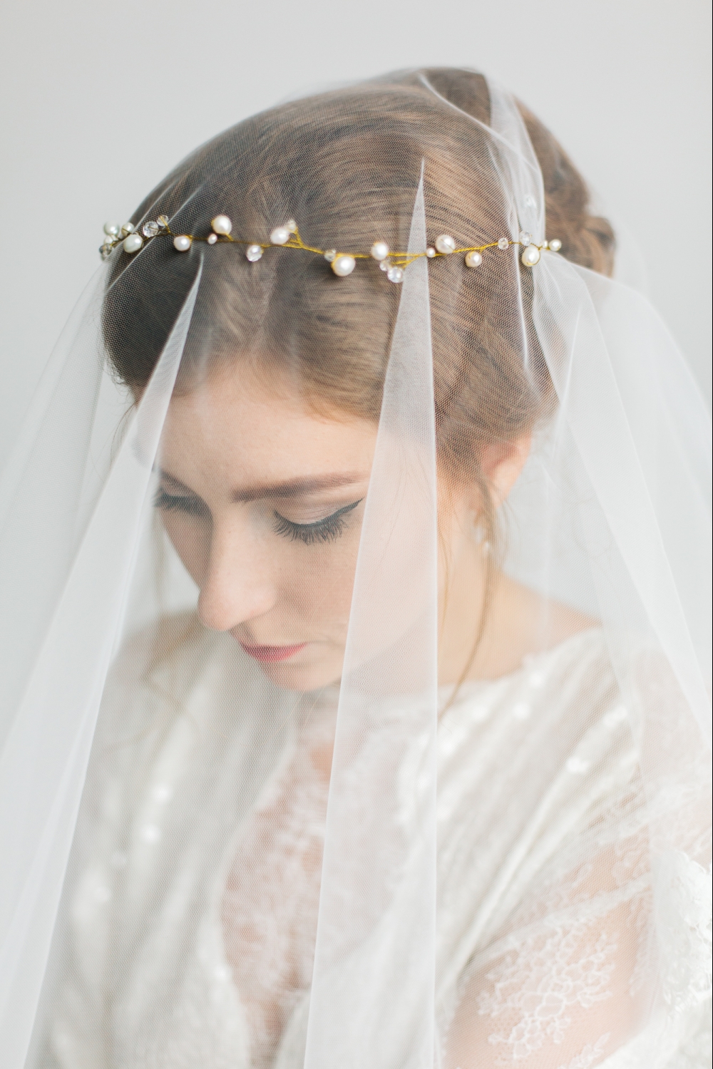 Когда вы закончите процесс создания свадебной прически, прикрепите булавкой кусочек материала к основной фате, создавая вуаль. Аналогичным образом вы можете прикрепить, но уже на затылке, темную крупную сетку. Это будет выглядеть, как дополнение к вашей прическе, слегка напоминая дамскую шляпку.