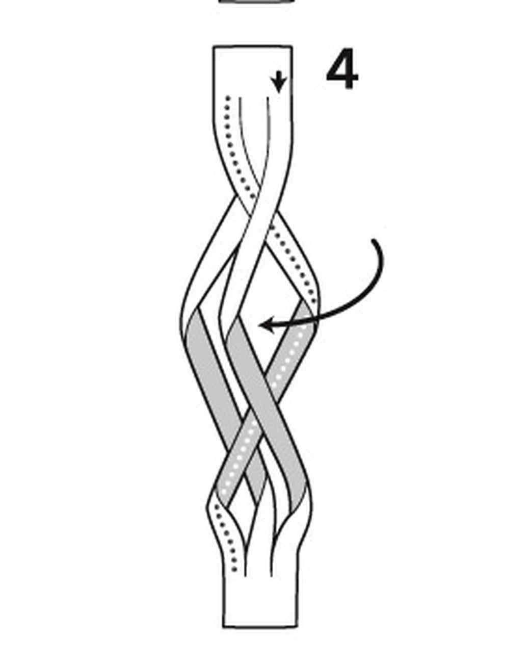 - Первая из четырех прядей пропускается под второй, накладывается на третью и подводится под четвертую.