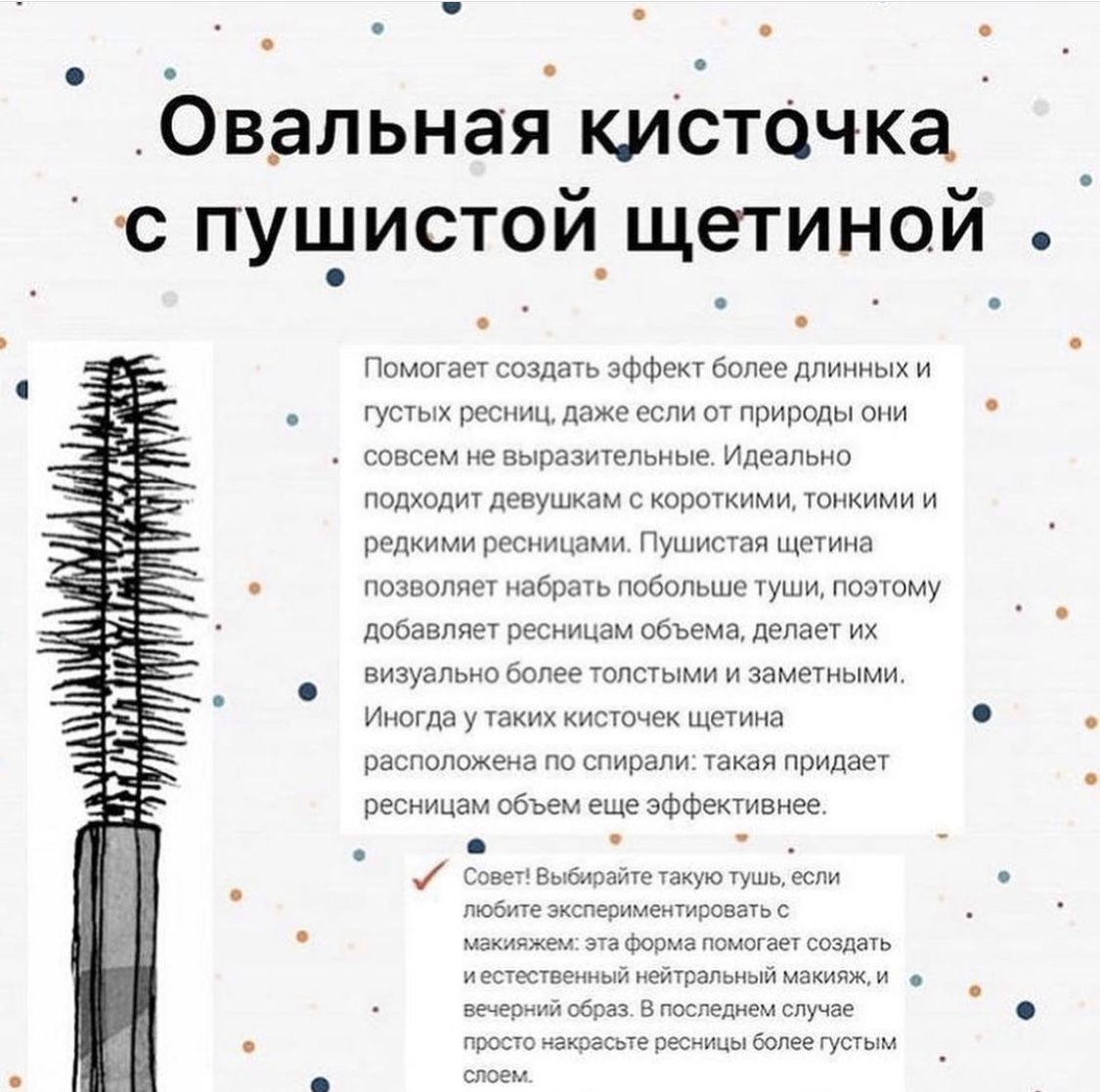 Например, тонкая щеточка для туши может подчеркнуть длину и свести к минимуму слипание. «Крошечные зубки распутывают короткие завитые ресницы, захватывая и покрывая даже самые маленькие волоски», — говорит Бартлетт. Между тем, кисть в форме песочных часов с густыми щетинками отлично подходит для создания объема и длины без комочков, так как форма позволяет равномерно распределить продукт от корней до кончиков.