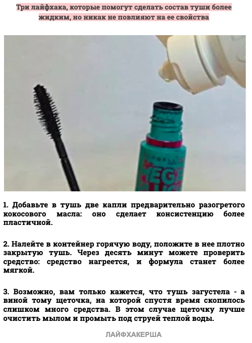 Данный способ актуален только для той загустевшей или засушенной туши для ресниц, которая является водорастворимой. С другими марками данный номер не пройдет.