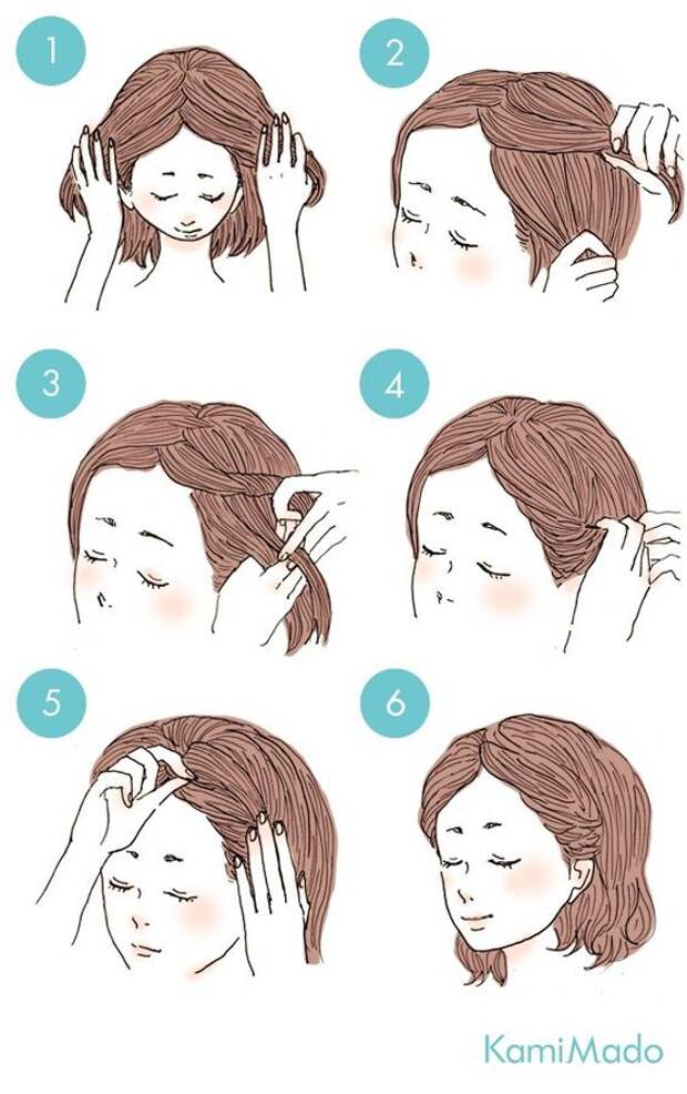 Немного начешите челку, чтобы добавить объема волосам, а затем поднимите челку вверх и набок. Закрепите укладку невидимками. Еще один интересный способ: разделите челку на три равных части, закрутите каждую по часовой стрелке и заколите назад при помощи невидимок.