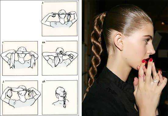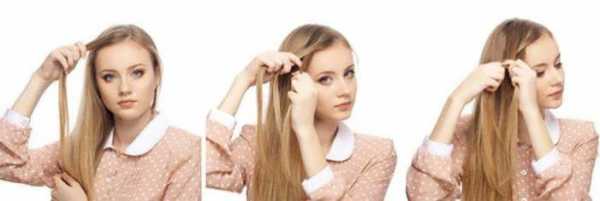 При выполнении такой прически, не нужно допускать появление петухов, поэтому нужно стараться натягивать волосы. Затем нужно справа отделить волосы, они должны расположиться в руке с противоположной стороны.