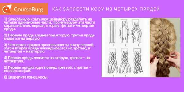 Как плести косу из четырех прядей: 1) Зачесанные к затылку волосы разделить на четыре одинаковые части, мысленно пронумеруйте их слева направо. 2) Первую прядь слева кладем под вторую, третья прядь кладется на первую. 3) Четвертая прядка просовывается снизу первой, затем вторая прядь накладывается на третью, а четвертая на вторую. 4) Первая прядь ложится на вторую, третья на четвертую. 5) Первая прядка идет поверх третьей, а третья поверх второй. 6) Закрепляем косу резинкой.Также рекомендуем