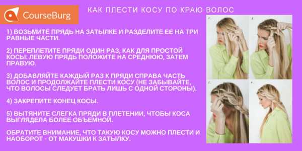 Как плести косу по краю волос: 1) Возьмите прядь на затылке, разделите ее на три равные части. 2) Переплетите пряди один раз, как для простой косы: левую прядь положите на среднюю, затем правую на среднюю. 3) Добавляйте каждый раз к пряди справа часть волос и продолжайте плести косу (волосы стоит брать лишь с одной стороны). 4) Закрепите концы косы. 5) Слегка вытяните пряди для придания объема косе.6. Как заплести косу «Рыбий хвост» самой себе