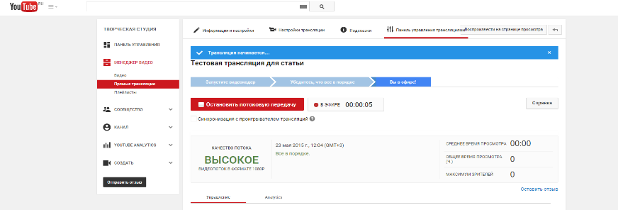 7. Вернитесь на панель инструментов YouTube и нажмите «Начать трансляцию».