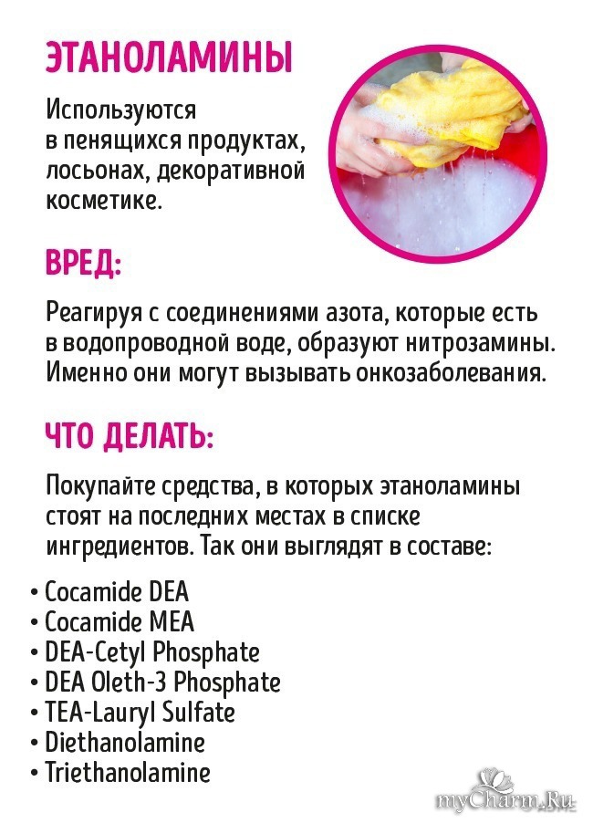 Cocamide DEA — diethanolamine Cocamide MEA, Monoethanolamine Cocamide TEA, Triethanolamine Кокамид ДЭА, диэтаноламин Моноэтаноламин МЭА Триэтаноламин, ТЭА | — Легко вступая в реакцию с другими компонентами, это опасное трио химвеществ способно образовывать канцерогенные нитрозамины, вызывающие онкологические заболевания печени и почек. — Чаще всего в средствах для мытья – шампунях, жидком мыле, гелях для душа. А также в красках для волос, помадах и разных пенах для ванн |