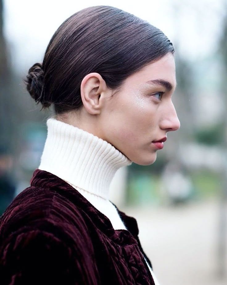 Если вы не чувствуете себя комфортно с открытым лицом и не готовы расстаться с челкой – попробуйте один из трех вариантов: 1) попросите мастера сделать ее рваной и слегка небрежной – чтобы уйти от прямой геометричной формы; 2) вспомните лучшие стихотворения Анны Ахматовой и подстригите челку коротко – чтобы часть лба все-таки оставалась видна; 3) проведите эксперимент перед зеркалом и зачешите челку набок – продуманная ассиметрия в верхней части лица визуально «сгладит» рельеф и уменьшит объем носа.