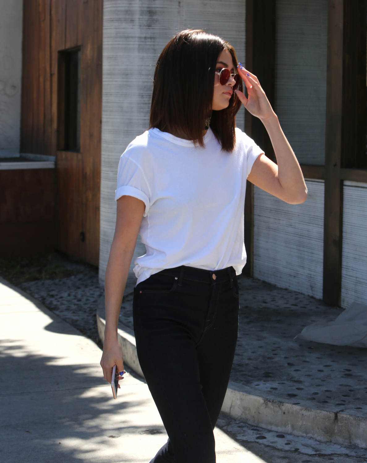 Стройная блондинка спиной к камере в футболке с надписью «городской герой»