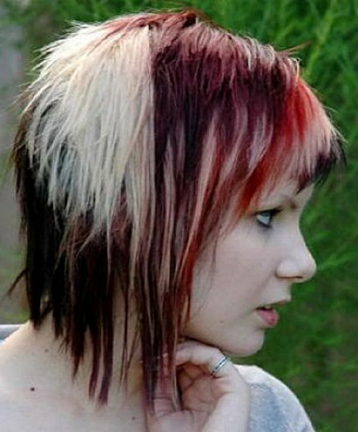 На короткие пряди допустимо подобрать любой тип стрижки. Зачастую широким спросом пользуется асимметричная укладка, которая базируется на том, что на одной стороне локоны будут более удлиненными, чем на другой. Челка будет рваной, как и концы локонов, прикрывая лицевую область и переходя в остальные волосы. Окрашивать локоны допустимо в любой цвет, но в основном идет сочетание ярких и темных тонов.