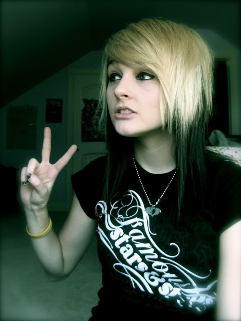 В этом драматическом воплощении двухцветной эмо-прически вы должны покрасить заднюю часть волос в темно-черный цвет, а переднюю часть обесцветить в красивый цвет платиновой блондинки.