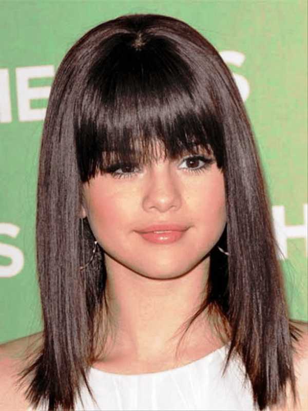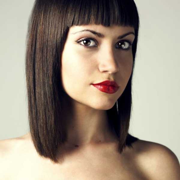 Правильно подобранный тип челки поможет скрыть недостатки и подчеркнуть достоинства лица. Короткая челка визуально удлиняет маленький лоб, придает лицу молодость, открытость и свежесть. Длинная — уменьшает высокий лоб, прибавляет загадочности взгляду. Сгладить квадратные черты лица поможет прямая челка, а косая — удлинит круглую форму лица. Для того чтобы стрижка каре до плеч с челкой смотрелась хорошо, волосы должны быть густыми. В противном случае не удастся добиться желаемого объема.