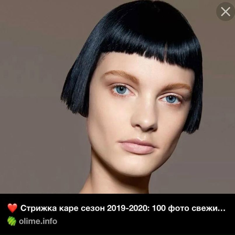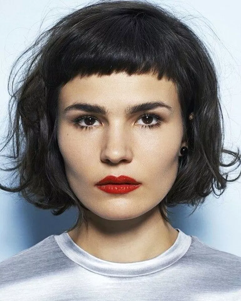 Прямая короткая челка – это, пожалуй, классика, они гармонична в комбинации со стрижками паж, каре и боб, причем лучше всего она выглядит на темных волосах, так как на светлых подобная челка теряется.