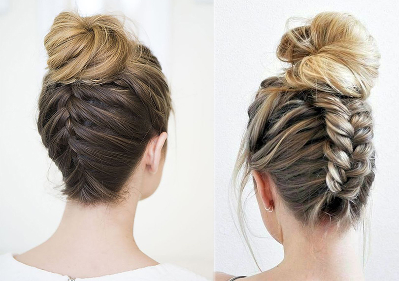 Коса и пучок — фантастическая пара, и, что еще лучше, перевернутый пучок также довольно легко сделать. Если вам нравится внешний вид, вы можете варьировать гладкие и взъерошенные прически, играть с количеством косичек и объемом пучка.