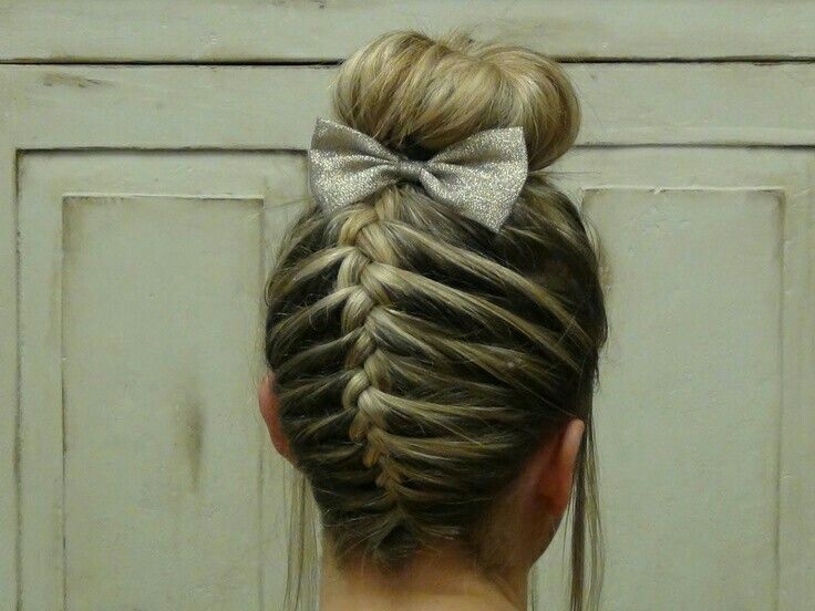 Перевернутая коса «рыбий хвост» — это просто потрясающе, она выглядит еще более сногсшибательно благодаря объемному пышному пучку, который она дополняет. Если у вас недостаточно волос, чтобы сделать большой пучок, подумайте о том, чтобы добавить пончик, чтобы завершить стиль.