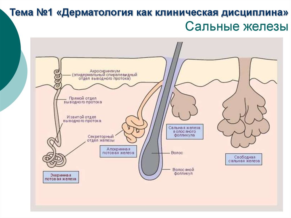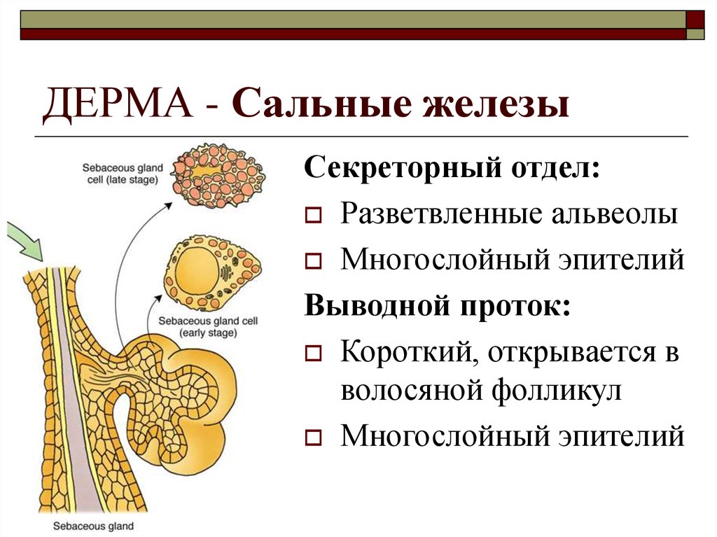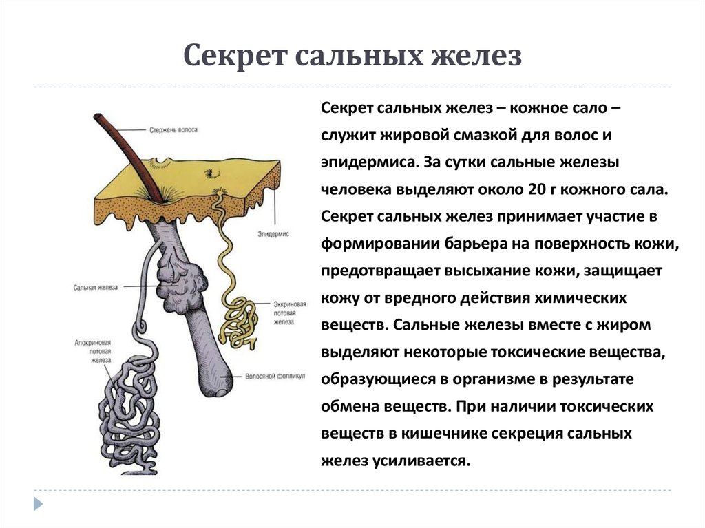 Сальные железы выделяют маслянистое вещество, называемое кожным салом. Это помогает защитить кожу от внешней среды.