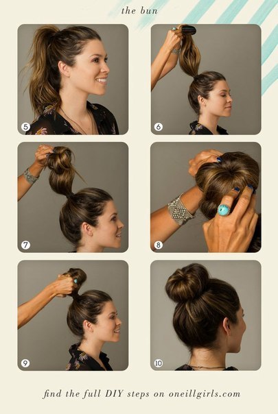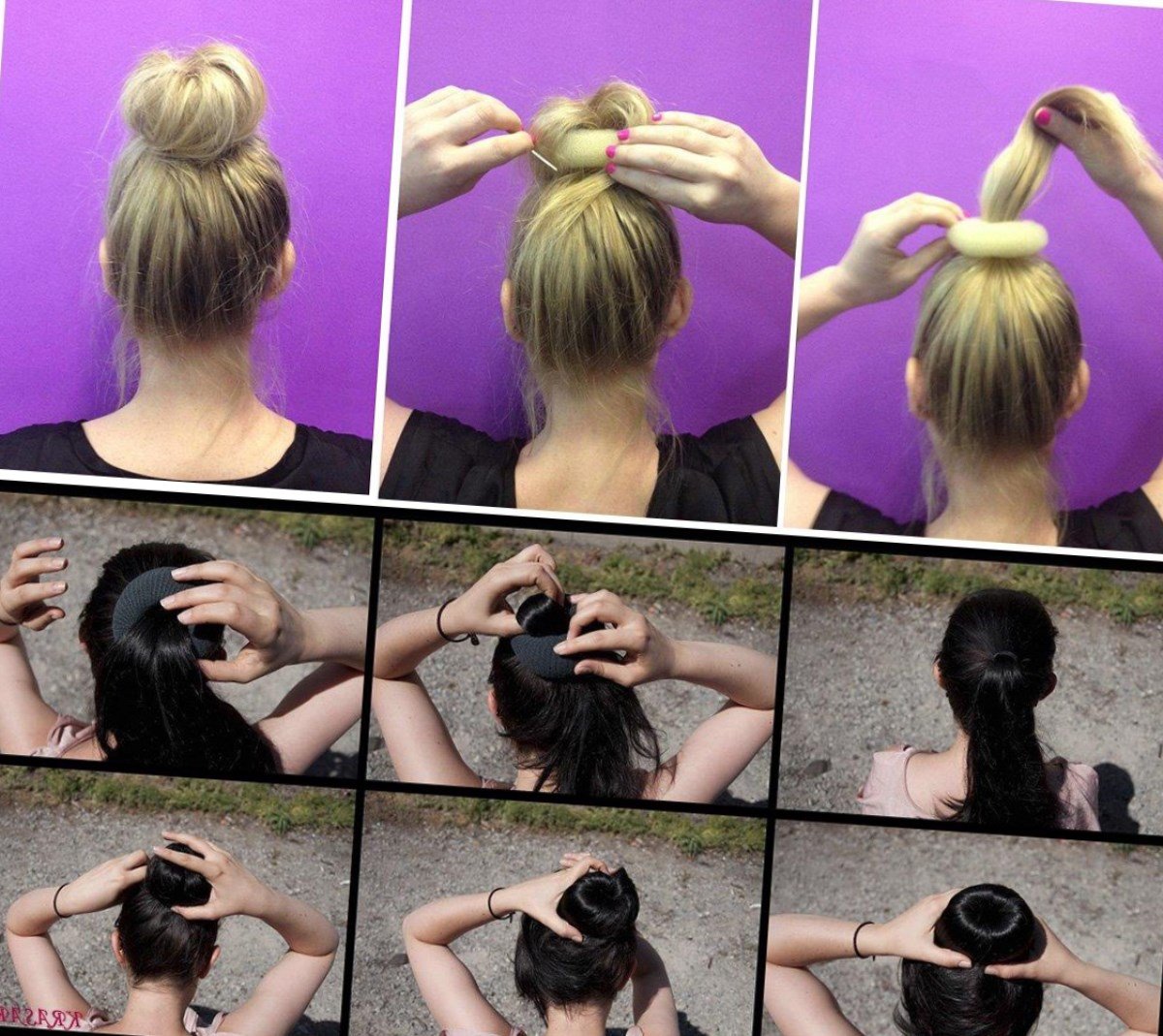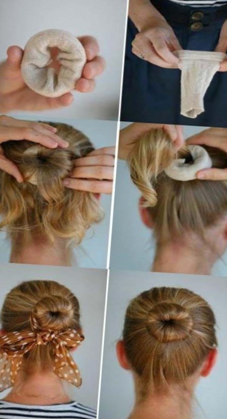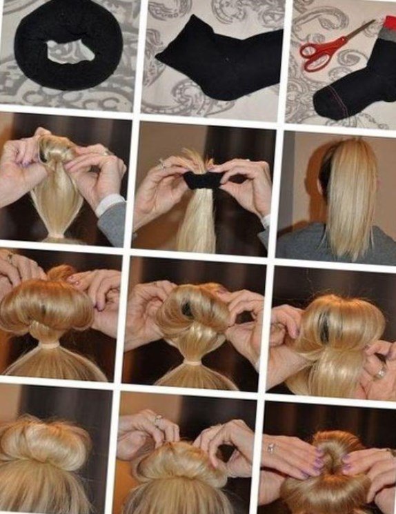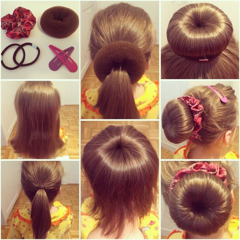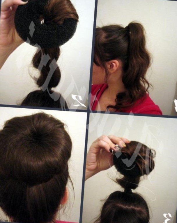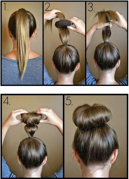- На затылке сделать тонкий хвост и одеть на него бублик.